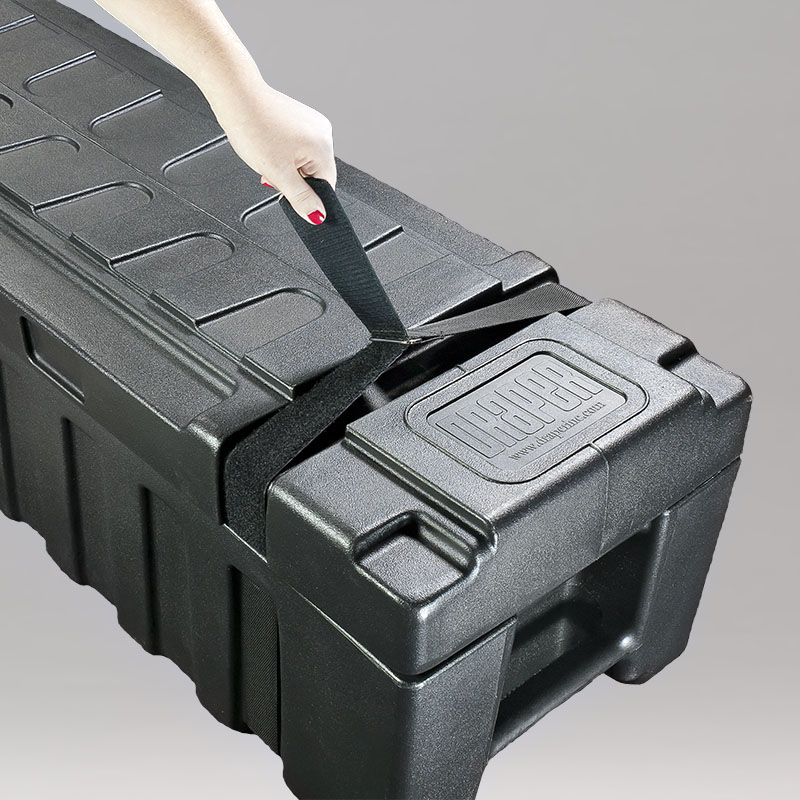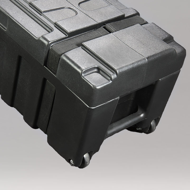 With stackable and vertical storage capabilities, the two-wheeled Heavy-Duty Case features a reinforced polyethylene shell and ample interior space for portable folding and modular projection screens. Molded inset ergonomic handle grips on each end support easy handling. Hook and loop fastener straps provide secure tie down support.