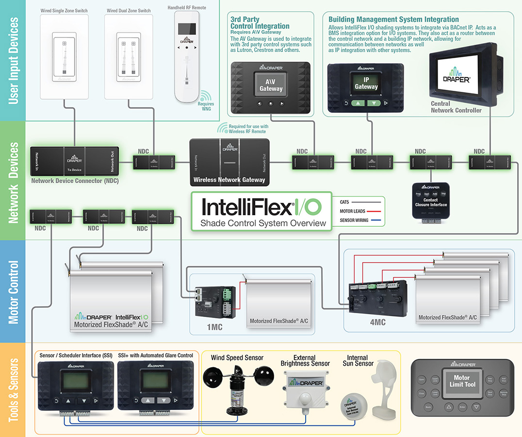 The Draper Intelliflex I/O is a complete control system that is flexible and expandable to the size and complexity of a project. It can be used with any type of shading system, or combination of shading systems on a project.